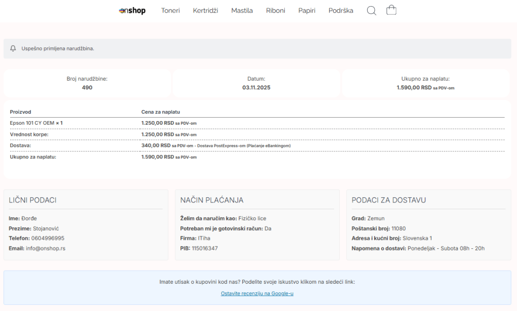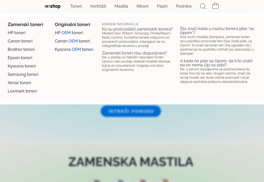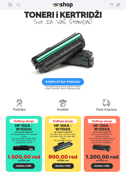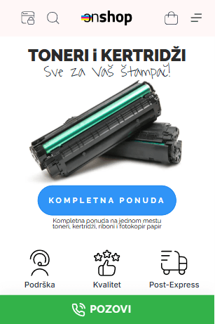 OnShop je moderna online prodavnica specijalizovana za prodaju tonera i kertridža za štampače, koja uspešno posluje više od godinu dana. Projekat je započet kao jednostavna e-commerce platforma namenjena lakšoj online kupovini potrošnog materijala za štampu, ali se vremenom razvio u ozbiljan prodajni sistem sa funkcionalnostima koje prate realne potrebe korisnika i tržišta. Prodavnica danas broji više od 1.400 artikala pažljivo organizovanih po kategorijama i modelima štampača, što kupcu omogućava da vrlo brzo pronađe odgovarajući proizvod. Ideja je bila da ceo proces — od pretrage artikla, do završetka narudžbine — bude maksimalno jednostavan, pregledan i vizuelno prijatan.
