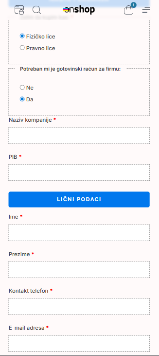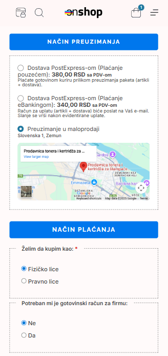Kada kupac odabere lično preuzimanje, sistem automatski sakriva nepotrebna polja kao što su adresa, grad i poštanski broj, čime proces poručivanja postaje brži i jednostavniji. Ispod se automatski prikazuje interaktivna Google mapa, koja dodatno olakšava pronalaženje lokacije. Pored standardnih podataka, razvijena su i dodatna checkout polja koja omogućavaju kupcu da izabere da li kupuje kao fizičko ili pravno lice. Na osnovu tog izbora, prikazuju se skrivena polja kao što su PIB, naziv firme ili tip računa, čime se sprečava konfuzija i smanjuje mogućnost greške.